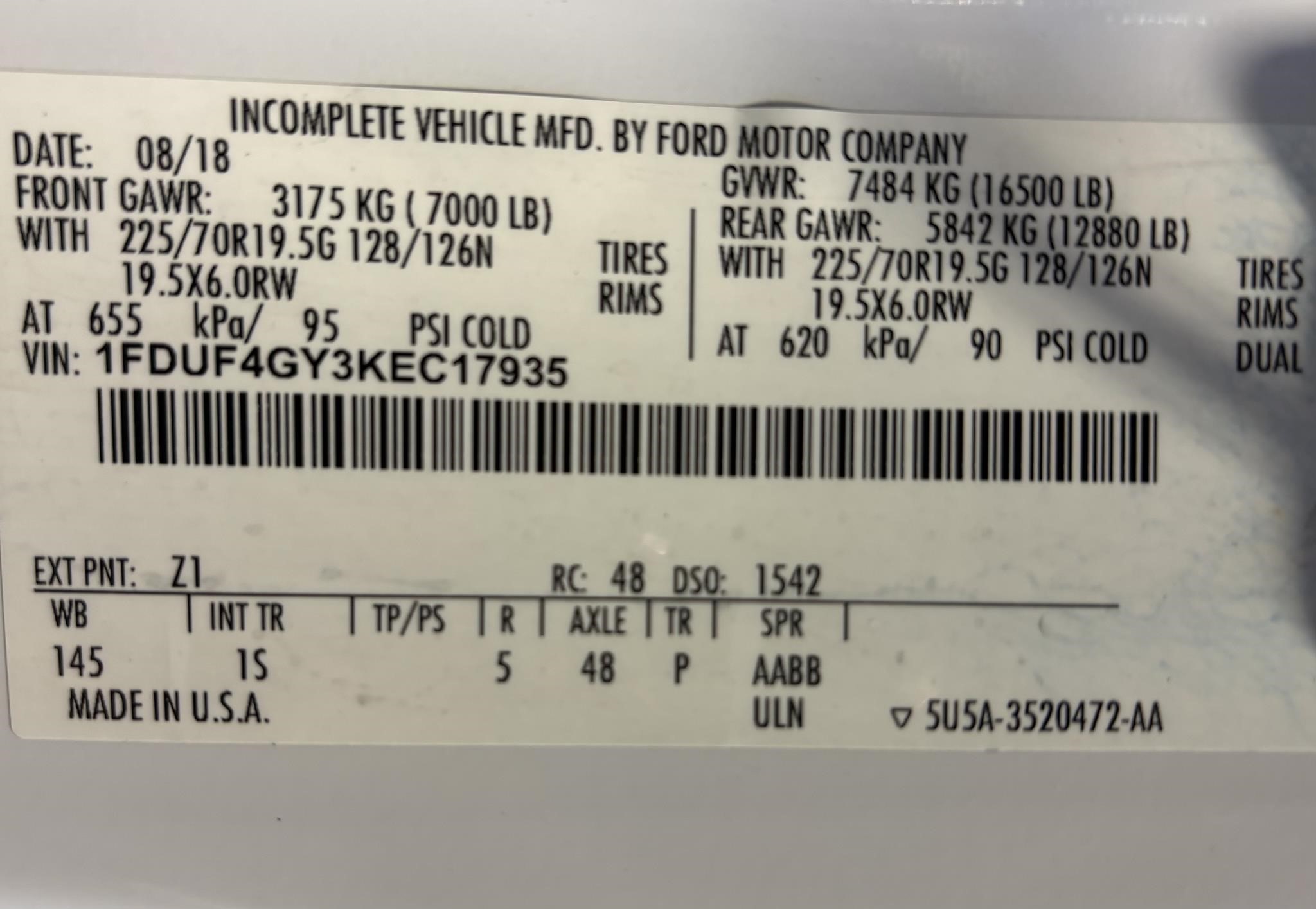 2019 Ford F-450 XL V-10 Gas - Automatic, Idle-Up Cruise, Power Group, Chrome Bumper, Cab Steps, 40/20/40 Split Bench. aluminum wheels, 19.5 225/70R tires. 16,500 GVWR