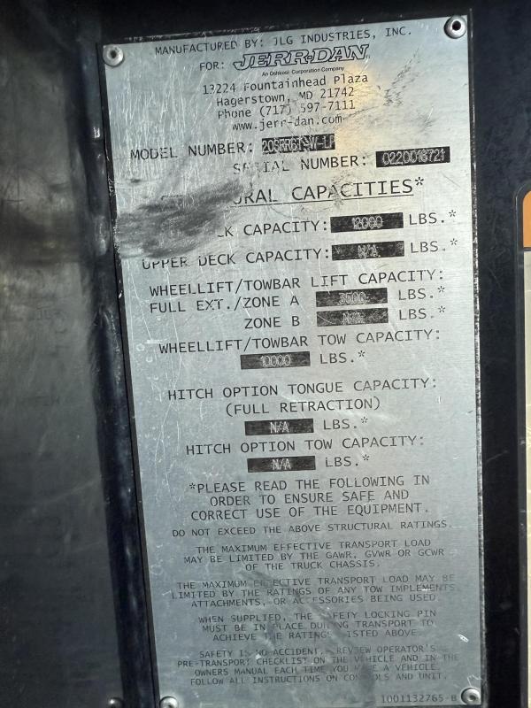 Jerr Dan 20’ Steel 12,000 LBS capacity. car carrier with Wheel lift. 3,500lb capacity. 8,000lb Ramsey winch.Dual lighted control stations, tow light plug, front chain bins, Winch cable tensioner, manual free wheel-winch, Serial # S/N: 20SRR6T-W-LP