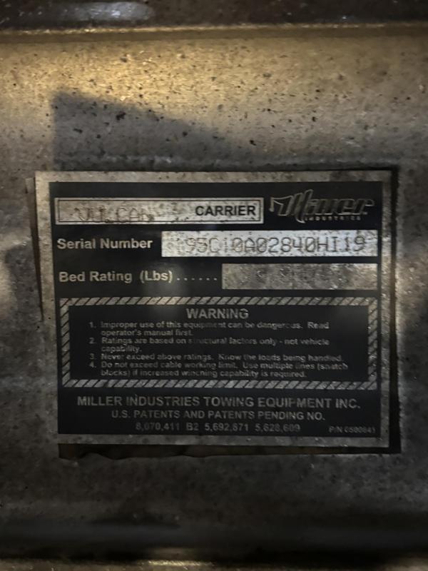 Chevron G-219.6" Aluminum Floor Rails (Aluminum) 4 Key Slot Package (Aluminum) 210" Full-Length Subframe Full-Length Slide Pads Right & Left Chain Trays Bed Anti-Tilt Lockout. Safety Chains (2-front, 2-rear) Positive Lock-down Painted with Black Acrylic Enamel (Subframe). Two Lift Cylinders Left & Right Side Illuminated Controls One Extension Cylinder, Federal Standard #108 LED Lighting Winch Clutch Release 8,000 lb. Hydraulic Winch w/50' Cable Cable Tensioner Full Function Wheel Lift System Cable Roller Guide Slide-In L-Arms with Anti-Theft Storage Tow Light Socket. Pre-Wired Electrical Junction Box Mud Flaps, Back-Up Lights & Alarm, Hydraulic Pump. Adjustable Rear Stabilizer. LED Light package included. Body SERIAL# 195C10AD2840HI19