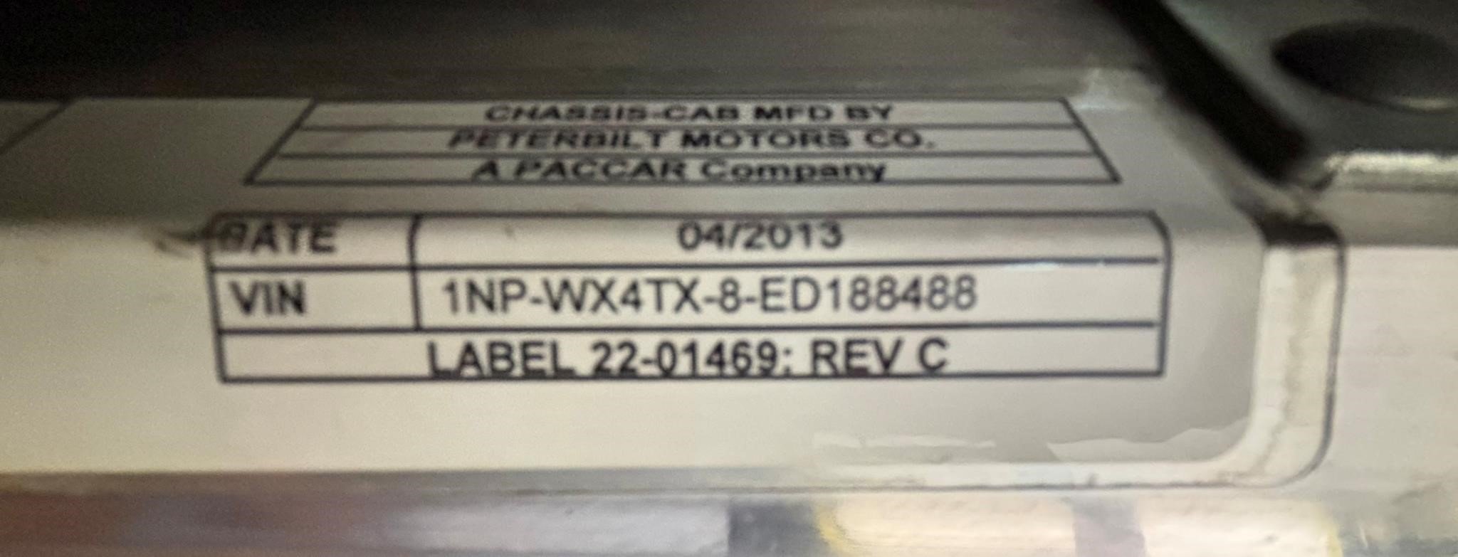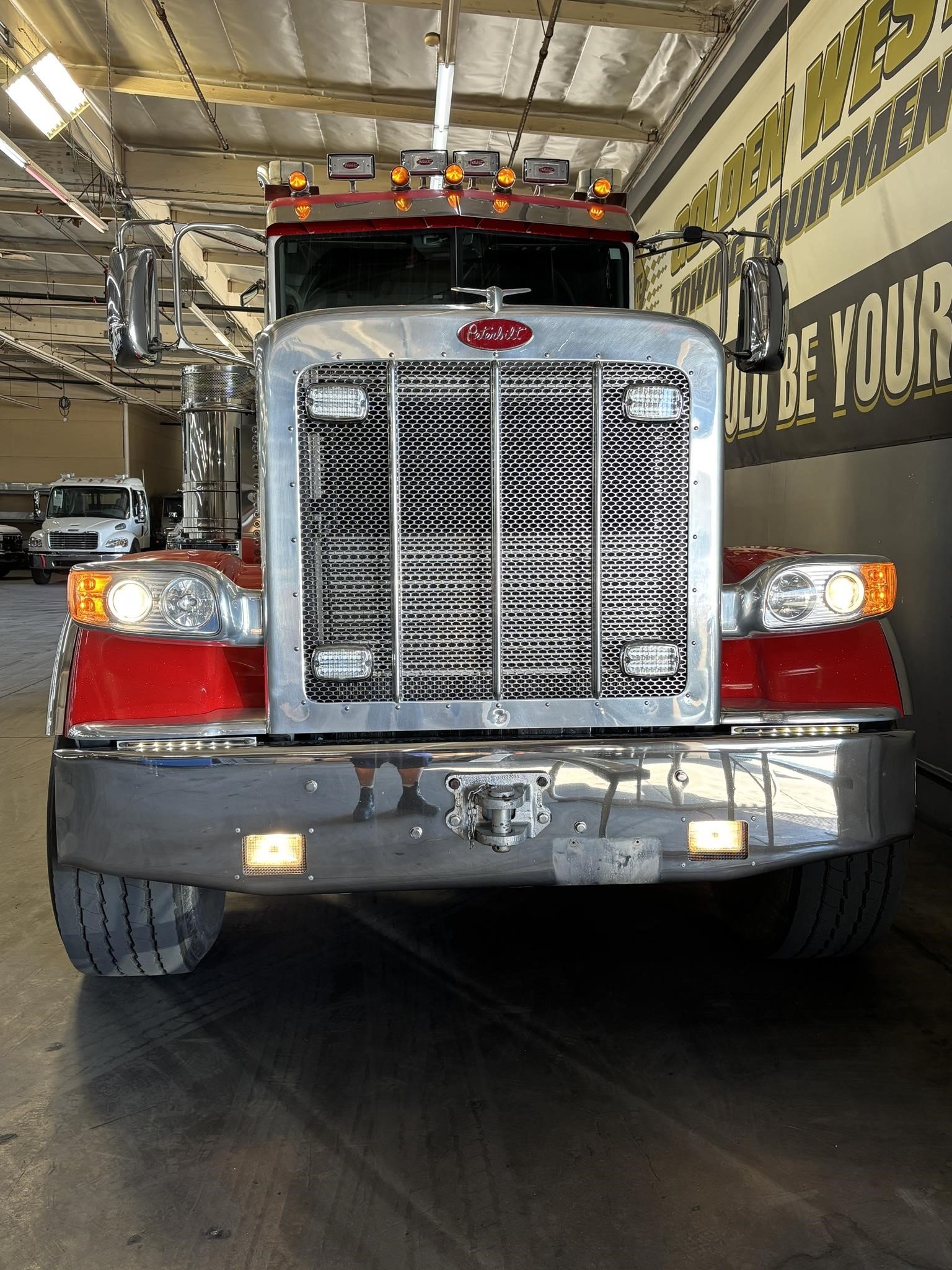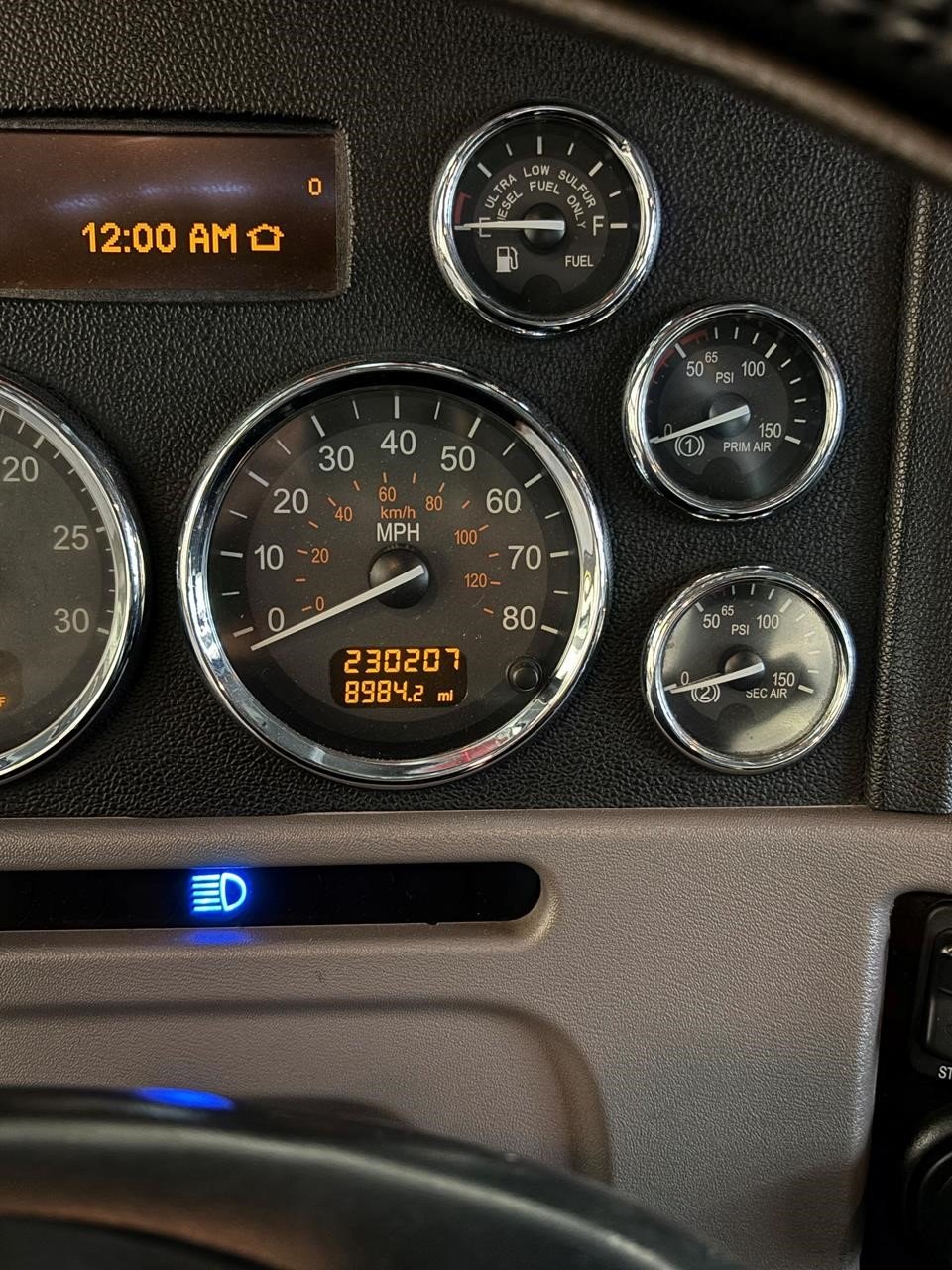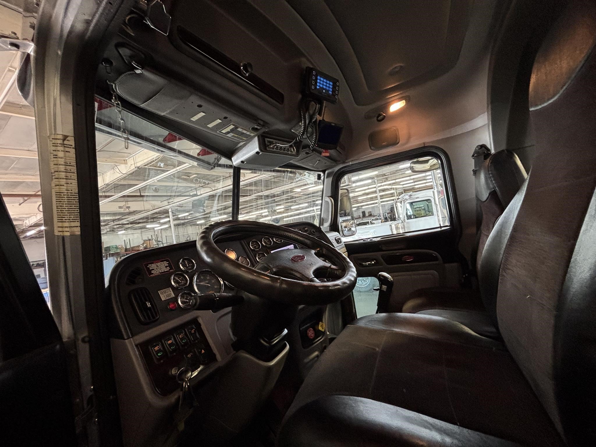 Pete 389 Extended cab. ISX15 565 HP Fuller RTLO16918B 18 Speed. .20,000 lb, 3.5in Drop, 20.000lb Front suspension. 26 in Aluminum 135 Gallon Fuel Tank LH U/C, DEF Tank Small, Alum Cab 123in BBC Alum Hood SFFA, 10-3/4in Steel Rails 403-444in.Full Steel Inner Liner.Heavy-Duty Iron Front Spring Brackets Fwd & Rear.Dana Spicer 46,000 lb, Ratio 3.91 Rear Axle. Diff Lock Both Axles. SBM Valve. Synthetic Axle Lubricant All Axles.Neway ADZ252 52,000 lbs, 54in -Dual Leveling Valves Bendix AD-IS Air Dryer with Heater. Polished Alum Air Tanks Outside Frame Rails.Aluminum Space Saver Battery Box LH BOC.DPF Cab Entry Aluminum Non-Slip Step RH Under Cab. Heavy Duty External Tow Eye. Intebrake (Furnished on Engine).(2) 13in SS Air Cleaners, Cowl Mtd, SS Caps. Thermal Insulation Package in Cab.Thermal Insulation Pkg - Adjustable Steering Column - Tilt/Telescope.Leather Steering Wheel. Platinum Interior - Grey . Power Lift Windows - Both Doors. Combo Fresh Air Heater/Air Conditioner. Cup Holder (Floor Mounted).Outside Sunvisor Stainless Steel. Aero Mirrors Ea Side Htd & Mtrzd 4-Way Adjustable. (4) Air Horns Rect-(2) 26in & (2) 29in. ConcertClass Audio System with CD. Bright Bezel Gauges ipo Black. Marker Lights (5) Bus LED Bullet. Fog Lights (2) Peterbilt. (1) 6in Spotlight Round Halogen LH.345" Wheelbase. Suspension Pressure Gauge. Stainless Steel Gravel Guards. 10 Inch Extension for Ultra Day Cab. Air Disc brake package. Diff. Lock Tandem Axles with speed Inte. RLOCK -Upgrade Clutch Torque Capacity. Peterbilt Keyless Entry, Platinum Interior - Arctic Gray, with SmartNav. Rubber Floor ipo Carpet (Black Only)., Cobra 40 Channel CB Radio w/Integral Speaker, Unibilt Cab Air Suspension. (2) Peterbilt Fog Lights. : Pusher axle Tire. (4) BR 14ply 285/75R24.5 M726ELA 2,679 540, Front tires.: MN 20ply 385/65R22.5 X Multiway HD XZE. RR: BR 16ply 11R24.5 M726ELA, (1) non-steerable pusher axle. 345" Wheelbase. 86,600 GVWR