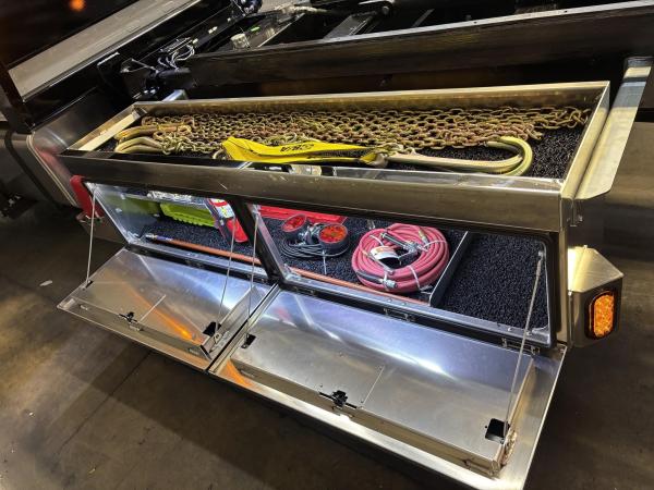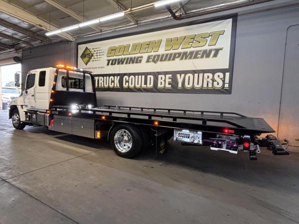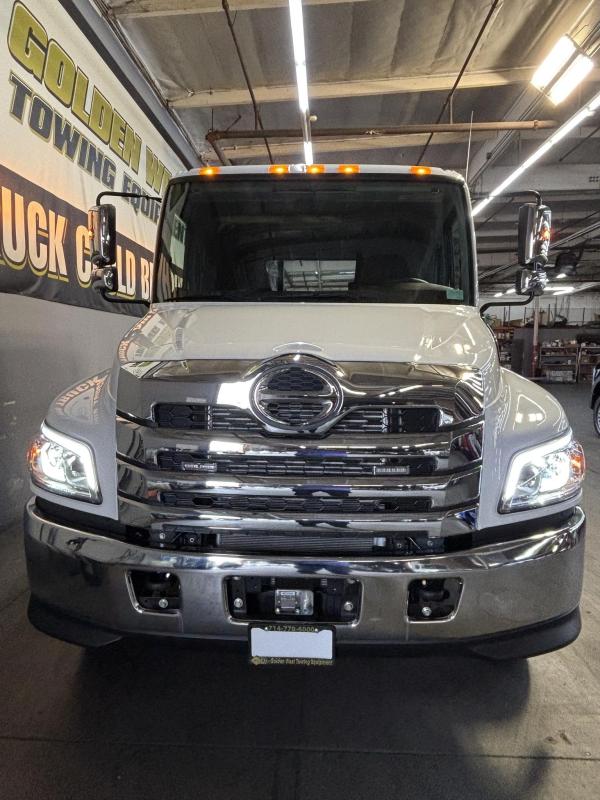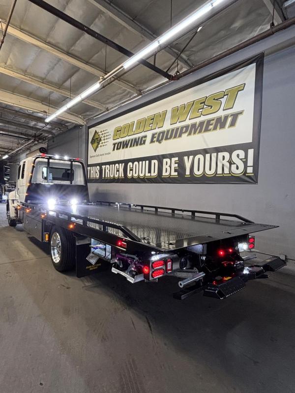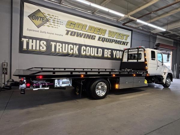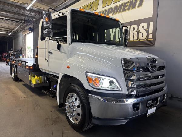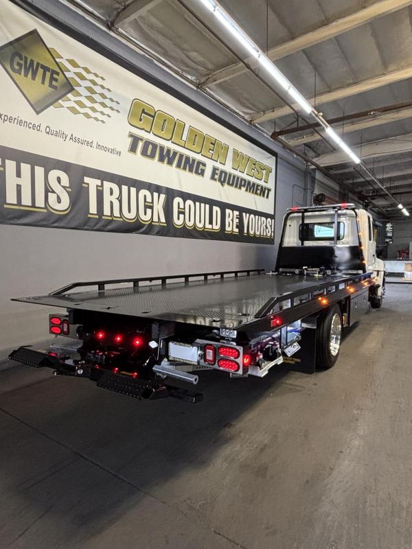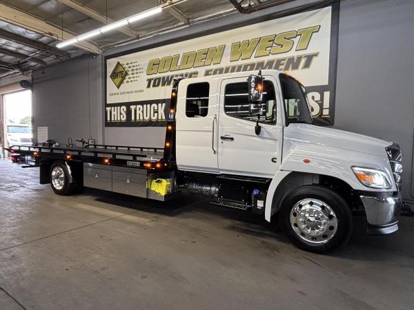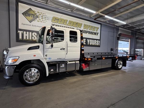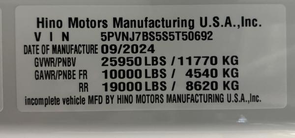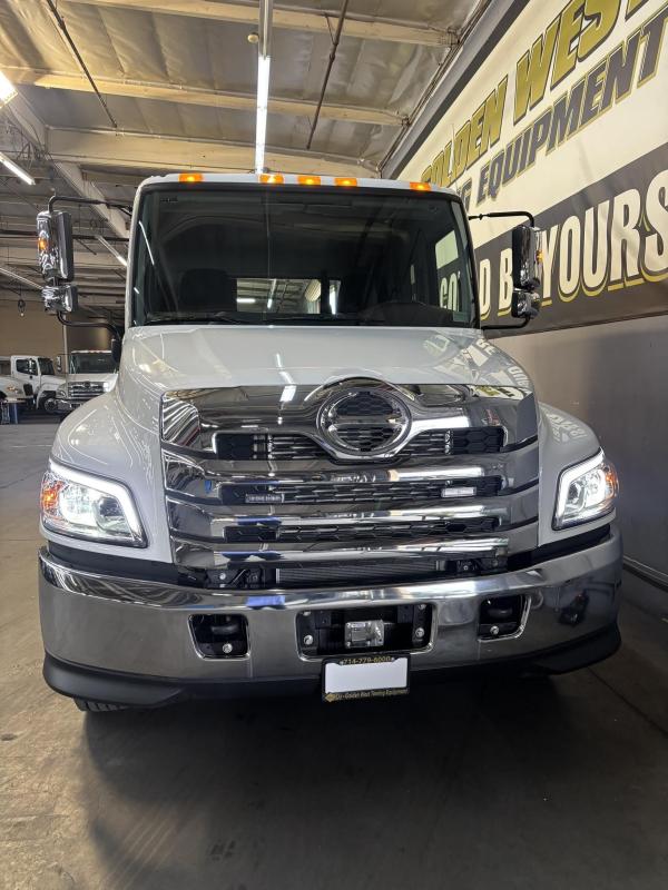 2025 Hino L-6 California Compliant - 260 HP Auto. Allison Automatic. Exhaust Brake, Air Brake package. 10,000lb front Axle 12K Front Suspension. 19,000lb Rear Axle, 5.13 Ratio. 52 52-gallon aluminum tank. 19,000lb Air suspension. Power Group, AM/FM Bluetooth.. Air ride driver seat. Single passenger seat. Rear Bench seat, cruise control, Idle up, chrome bumper -Aluminum wheels, Power Mirrors. Tilt wheel.. WB 22.5 25570R Tires. GVWR 25,950 149” CA ---- 5-year 300K Engine and After-treatment. 7-year unlimited -Allison Warranty-Century LCG 12 21.5' Steel LCG (Low Center of Gravity) Carrier w/ Wheel Lift, 3/16 Deck Plate, 2x2 Corten Tube Crossmembers on 8 inch Centers, (4) Rear Chain Locks, (2) Front Chain Locks, (6) Floor Plate Chain Locks (3 per side), 8K Ramsey winch, 3/8" x 50' Winch Cable, Illuminated Dual Controls, FMVSS 108 Lamp Group Shock Mounted Lighted, Direct Mount Pump, Cable Roller Guide w/ Tensioner, Winch Free Spool Extension, Back-Up Alarm, (2) Safety Chains, Mechanical Anti-tilt, Black Body Paint, 102" Wide Body, Inboard Tilt Cylinders, Floor Level Roll Formed w/ Punched Stake Pockets, 4,000lb Wheel Lift w/ Releasable L Arms, Fully Hydraulic Wheel Lift, (2) Safety Straps & Ratchets, (2) Rear Safety Chains, Body Lock w/ Nylatron roller Bearings, & 12,000lb Deck Load Rating, Body Serial # ST12L2C251609