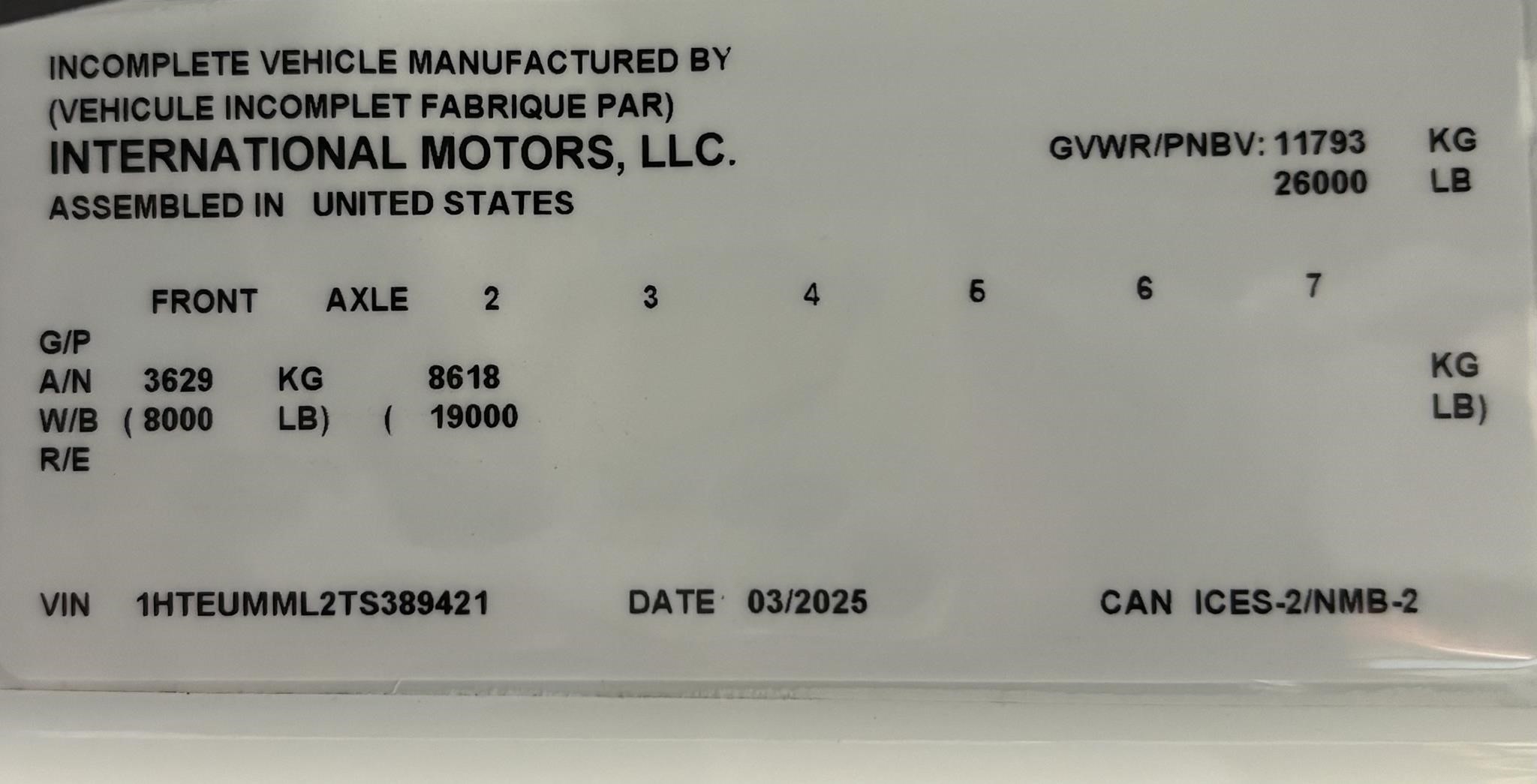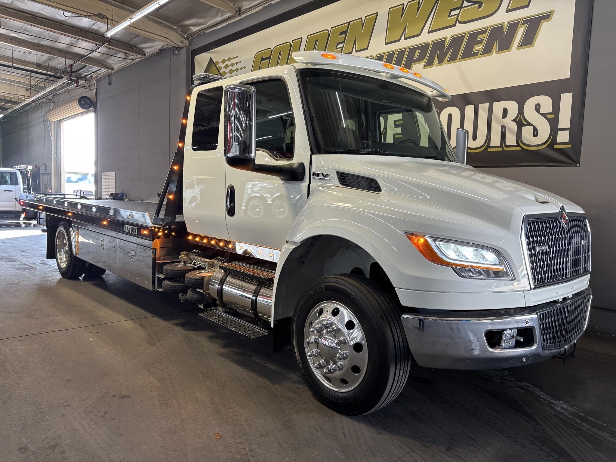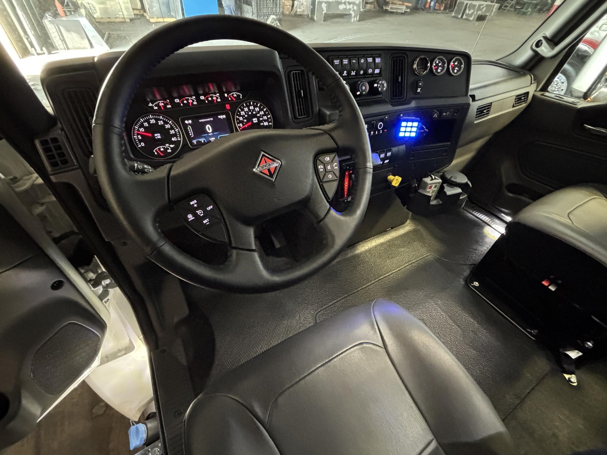 2026 International Model MV Extended cab. Cummins ISB 6.7L, 260HP @ 2,300 rpm, 660 lb-ft @ 1,600 rpm, Allison RDS-2200 6 Speed Auto, Air Brakes, Air Dryer Heater, Exhaust Brake, Front Axle: Dana-Spicer I-Beam 8,000lb w/ Shock Absorbers, Rear Axle: Dana-Spicer 19,000lb rear axle.. , 20,000lb Air Ride Suspension, 4.88 Rear Axle Ratio, Chrome Bumper, black Grille, Air Ride Driver Seat,& Passenger Seat, rear bench seat. Idle Up, Cruise Control, Tilt-Wheel, AM/FM/CD/MP3 w/ Bluetooth, Air Horn, Engine Block Heater, Dual 40-50 Gal Alum Fuel Tanks, 7 Gal DEF Tank, Power Windows, Power Door Locks, Power heated Mirrors. A/C, 255/70R22.5 Tires w/ 22.5 Alum Wheels, Cup holders.Visor 25,500 GVWR,