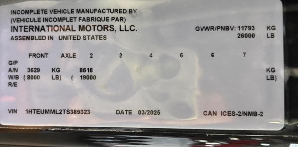 2026 International Model MV Extended cab. Cummins ISB 6.7L, 260HP @ 2,300 rpm, 660 lb-ft @ 1,600 rpm, Allison RDS-2200 6 Speed Auto, Air Brakes, Air Dryer Heater, Exhaust Brake, Front Axle: Dana-Spicer I-Beam 8,000lb w/ Shock Absorbers, Rear Axle: Dana-Spicer 19,000lb rear axle.. , 20,000lb Air Ride Suspension, 4.88 Rear Axle Ratio, Chrome Bumper, black Grille, Air Ride Driver Seat,& Passenger Seat, rear bench seat. Idle Up, Cruise Control, Tilt-Wheel, AM/FM/CD/MP3 w/ Bluetooth, Air Horn, Engine Block Heater, Dual 40-50 Gal Alum Fuel Tanks, 7 Gal DEF Tank, Power Windows, Power Door Locks, Power heated Mirrors. A/C, 255/70R22.5 Tires w/ 22.5 Alum Wheels, Cup holders.Visor 25,500 GVWR,Extended Warranties.- Engine Warranty: 5 yr / 300k miles PPI & after treatment, and Tranny Warranty: 7 yr / Unlimited Miles.