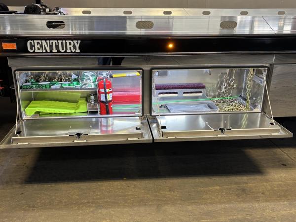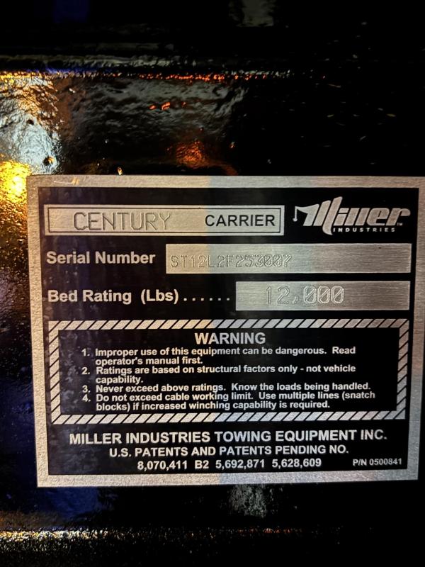 Century Steel LCG (Low Center of Gravity) Carrier w/ Wheel Lift, 3/16 Deck Plate, 3x2 Corten Tube Crossmembers on 8 inch Centers, (4) Rear Chain Locks, (2) Front Chain Locks, (6) Floor Plate Chain Locks (3 per side), 8,000lb Worm Gear Winch, 3/8" x 50' Winch Cable, Illuminated Dual Controls, FMVSS 108 Lamp Group Shock Mounted Lighted, Direct Mount Pump, Cable Roller Guide w/ Tensioner, Winch Free Spool Extension, Back-Up Alarm, (2) Safety Chains, Mechanical Anti-tilt, Black Body Paint, 102" Wide Body, Inboard Tilt Cylinders, Floor Level Roll Formed w/ Punched Stake Pockets, 4,000lb Wheel Lift w/ Releasable L Arms, Fully Hydraulic Wheel Lift, (2) Safety Straps & Ratchets, (2) Rear Safety Chains, Body Lock w/ Nylatron Toller Bearings, & 12,000lb Deck Load Rating. Body SN# ST12L2F253007