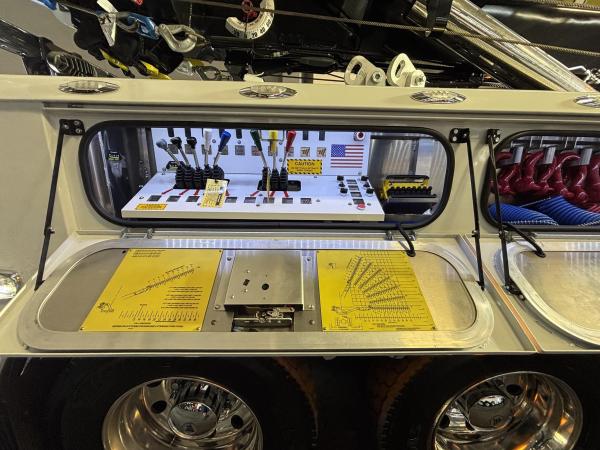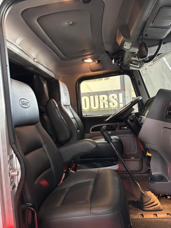 Pete 389 LONG HOOD> ISX15 605 HP 1950 Torque. Fuller RTLO16918B 18 Speed. .22,000 lb, 3.5in Drop,front axle. 23.000lb Front suspension. 26 in Aluminum 90 & 60 Gallon Fuel Tanks LH U/C, DEF Tank Small, Alum Cab 131in BBC Alum Hood SFFA, 10-3/4in Steel Rails 403-444in.Full Steel Inner Liner.Heavy-Duty Iron Front Spring Brackets Fwd & Rear.Dana Spicer 46,000 lb, Ratio 4.10 Rear Axle. Diff Lock Both Axles. SBM Valve. Synthetic Axle Lubricant All Rear Axles 52,000lbs,Neway 54in -Dual Leveling Valves Bendix AD-IS Air Dryer with Heater. Polished Alum Air Tanks Outside Frame Rails.Aluminum Space Saver Battery Box LH BOC.DPF Cab Entry Aluminum Non-Slip Step RH Under Cab. Heavy Duty External Tow Eye. Intebrake (Furnished on Engine).(2) 15in SS Air Cleaners, Cowl Mtd, SS Caps. Thermal Insulation Package in Cab.Thermal Insulation Pkg - Adjustable Steering Column - Tilt/Telescope.Leather Premiun Steering Wheel with Multi Functions. Platinum Interior - Grey . Power Lift Windows - Both Doors. Combo Fresh Air Heater/Air Conditioner. Cup Holder (Floor Mounted).Outside Sunvisor Stainless Steel. Aero Mirrors Ea Side Htd & Mtrzd 4-Way Adjustable. (4) Air Horns Rect-(2) 26in & (2) 29in. ConcertClass Audio System with Bluetooth.. Bright Bezel Gauges ipo Black. Woodgrain dash optionMarker Lights (5) Bus LED Bullet. Fog Lights (2) Peterbilt. (1) 6in Spotlight Round Halogen LH. Suspension Pressure Gauge. Stainless Steel Gravel Guards. 10 Inch Extension for Ultra Day Cab. Air Disc brake package. Diff. Lock Tandem Axles with Speed Inte. RLOCK -Upgrade Clutch Torque Capacity. Peterbilt Keyless Entry, Platinum Interior - Arctic Gray, with SmartNav. Rubber Floor ipo Carpet (Black Only)., Cobra 40 Channel CB Radio w/Integral Speaker, Unibilt Cab Air Suspension. (2) Peterbilt Fog Lights. Sears Atlas 80 high-back ultra-leather seats, black, for Driver and Passenger. : Pusher axle Tire. (4) BR 14ply 285/75R24.5 M726ELA 2,679 540, Front tires.: MN 20ply 385/65R22.5 X Multiway HD XZE. RR: BR 16ply 11R24.5 M726ELA, (1) non-steerable pusher axle. 44" Sleeper, Stainless Steel sleeper vents. block heater..Texas-style steel Chrome bumper. Stainless Steel visor, Midlevel speaker option cab, and Sleeper. SMARTLING. 24 months sub. option RAMI Multi band Attentas. Wheelbase 360" two-stage paint metallic Pearl 86,600 GVWR5-year, $ 350K X15 PER/PRO Extended Engine Warranty.