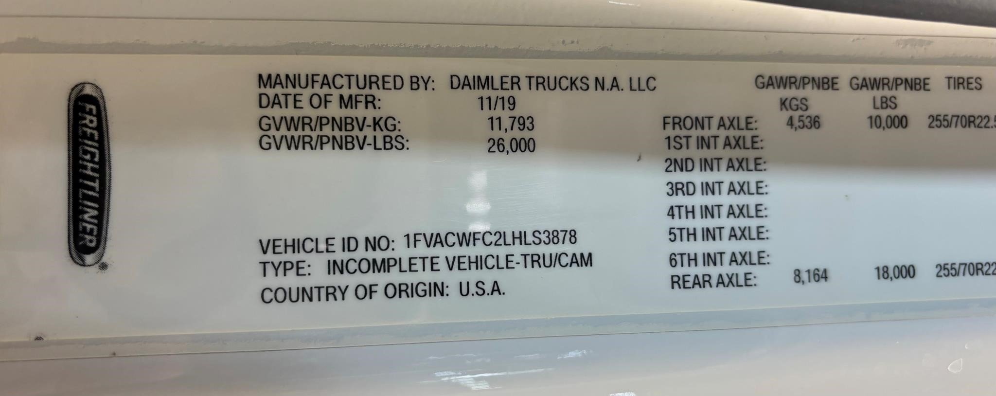 M-2 Alum. 132" BBC Cab; Cummins 6.7L Engine 260HP 660lbs Torque. Cummins Exhaust brake.Horton HT650 Frontal Air On/off Engine fan. Clutch. 2100 RDS Automatic Transmission 6 Speed. Phillips-TEMRO 750 Watt/115 Volt block heater. dash-mounted T-Handle Cable Shift Control w/ park brake position. Synthetic Transmission Fluid.Synthetic 75W-90 Front Axle lube 10,000# front suspension. ARS-19.0-2 19,000# R-SERIES single rear axle. 4.88 Rear Axle Ratio.SYNTHETIC 75W-90 rear Axle lube. Airliner 18,000# Rear Suspension. Manual Dump Valve for Air Suspension. - Air brake package. Air Dryer w/Heater. 120KSI (Frame). 50 Gallon/Rectangular fuel tank aluminum: Alliance Fuel filter/Water separator with Primer pump. 255/70R22.5 Tires. Alum. 22.5X8.25 10-Hub pilot disc wheels. Dual West Coast Bright mirrors. 8" bright finish convex mirrors mounted under primary mirrors. Non-operating wing windows. Opal Gray Vinyl Interior. (2) Cup Holders; Heater, Defroster & Air Conditioner. Power windows. Single passenger seat. Air ride driver seat, Rear bench seat. Adjustable Tilt and Telescoping Steering Column. (6) IGN Controlled Extra Switches to junction block AND 1 Circuit at 30 Amp. Windshield Wiper motor with Delay marker light Switches self-canceling turn signal Switch with dimmer, Washer/Wiper & Hazard in Handle. Idle up, Cruise control. 22.5 Aluminum wheels 25,500 GVWR.