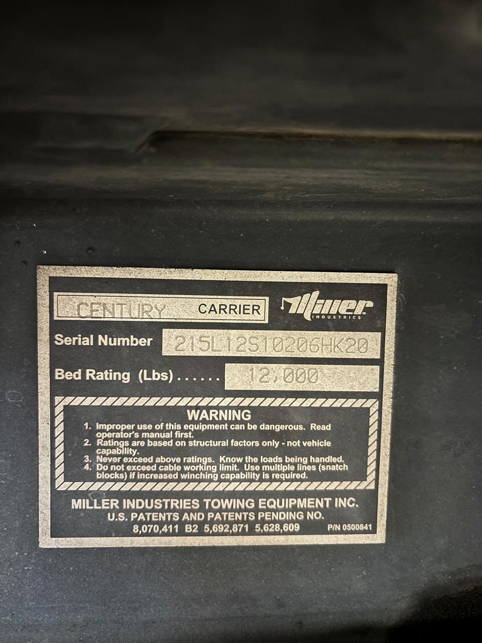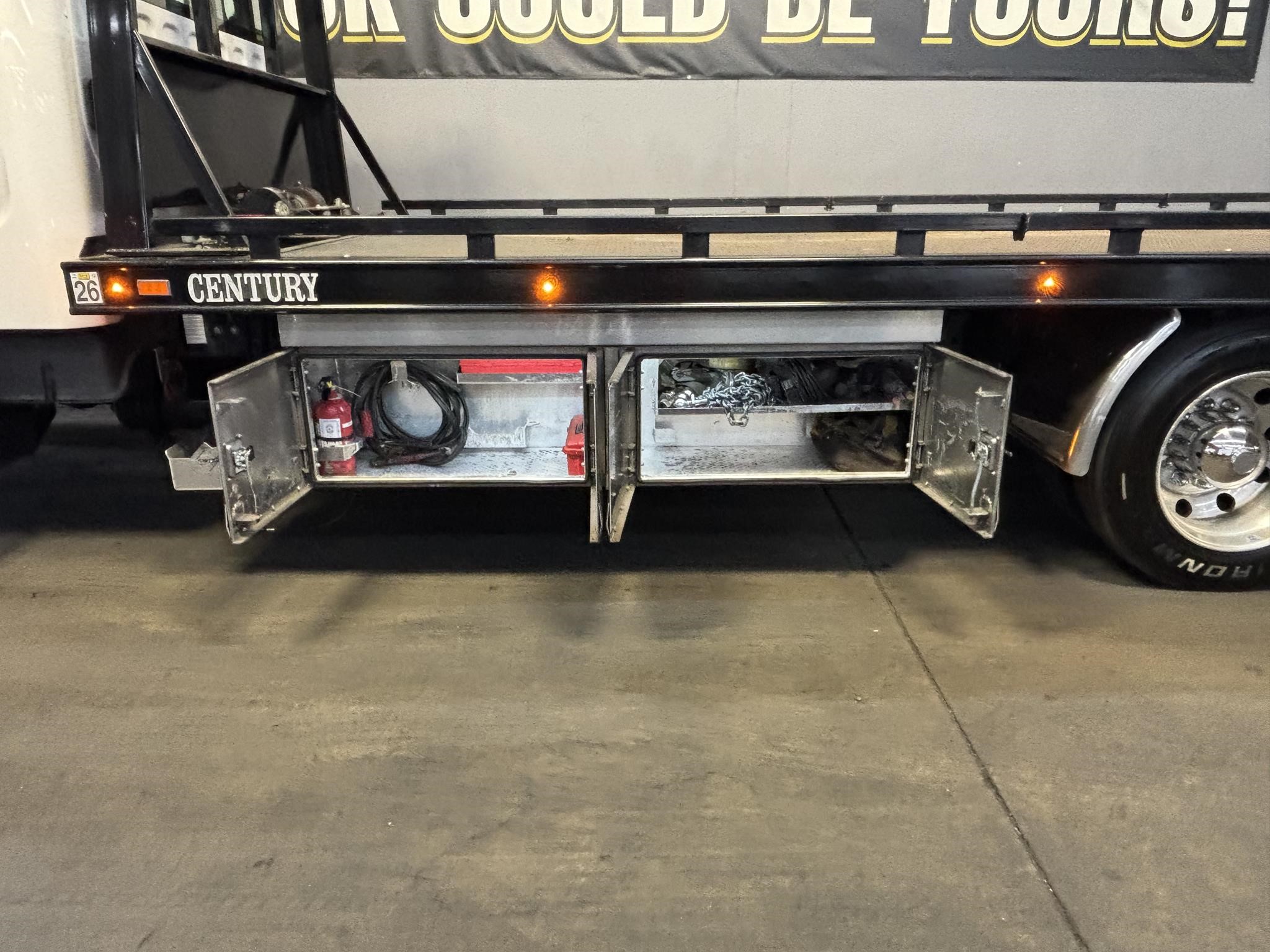 Century 21.5' Steel LCG (Low Center of Gravity) Carrier w/ Wheel Lift, 3/16 Deck Plate, 3x2 Corten Tube Crossmembers on 8 inch Centers, (4) Rear Chain Locks, (2) Front Chain Locks, (6) Floor Plate Chain Locks (3 per side), 8,000lb Worm Gear Winch, 3/8" x 50' Winch Cable, Illuminated Dual Controls, FMVSS 108 Lamp Group Shock Mounted Lighted, Direct Mount Pump, Cable Roller Guide w/ Tensioner, Winch Free Spool Extension, Back-Up Alarm, (2) Safety Chains, Mechanical Anti-tilt, Black Body Paint, 102" Wide Body, Inboard Tilt Cylinders, Floor Level Roll Formed w/ Punched Stake Pockets, 4,000lb Wheel Lift w/ Releasable L Arms, Fully Hydraulic Wheel Lift, (2) Safety Straps & Ratchets, (2) Rear Safety Chains, Body Lock w/ Nylatron Roller Bearings, & 12,000lb Deck Load Rating. Body Serial# 215L12S10206HK20