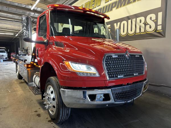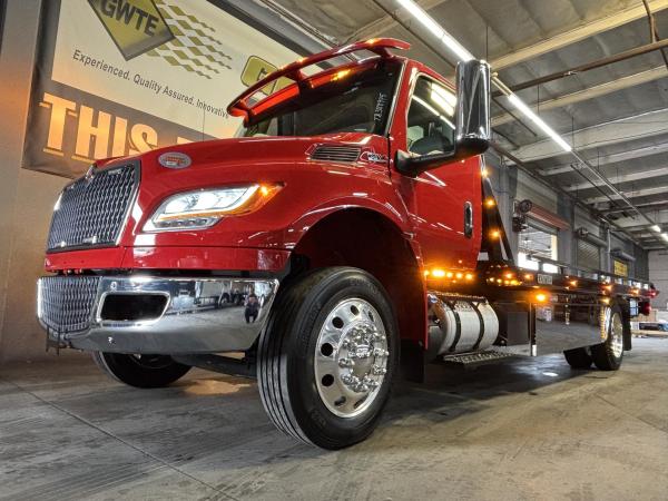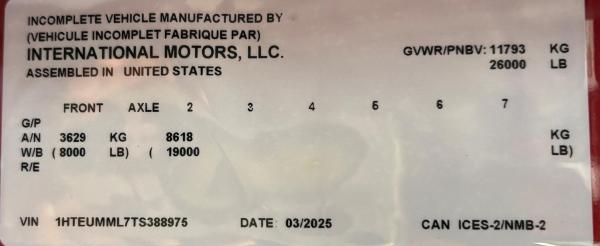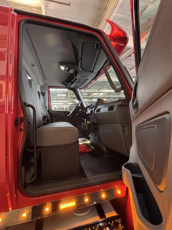 International Model MV Regular. Cummins ISB 6.7L, 260HP @ 2,300 rpm, 660 lb-ft @ 1,600 rpm, Allison RDS-2200 6 Speed Auto, Air Brakes, Air Dryer Heater, Exhaust Brake, Front Axle: Dana-Spicer I-Beam 8,000lb w/ Shock Absorbers, Rear Axle: Dana-Spicer 19,000lb rear , 20,000lb Air Ride Suspension, 4.88 Rear Axle Ratio, Chrome Bumper, black Grille, Air Ride Driver Seat,& Passenger Seat, rear bench seat. Idle Up, Cruise Control, Tilt-Wheel, AM/FM/CD/MP3 w/ Bluetooth, Air Horn, Engine Block Heater, Dual 40-50 Gal Alum Fuel Tanks, 7 Gal DEF Tank, Power Windows, Power Door Locks, Power heated Mirrors. A/C, 255/70R22.5 Tires w/ 22.5 Alum Wheels, Cup holders.Visor 25,500 GVWR,.