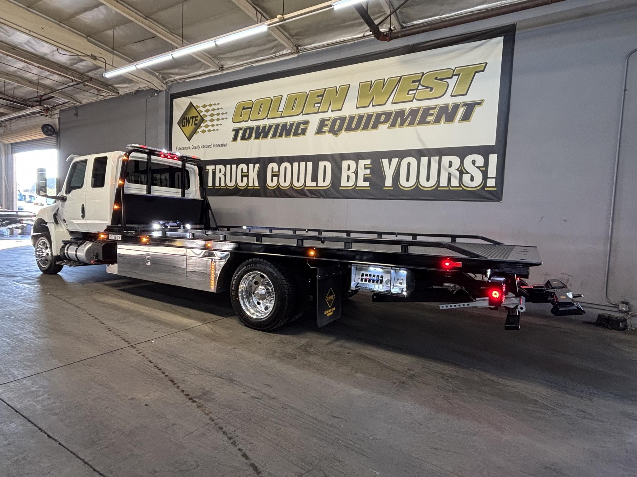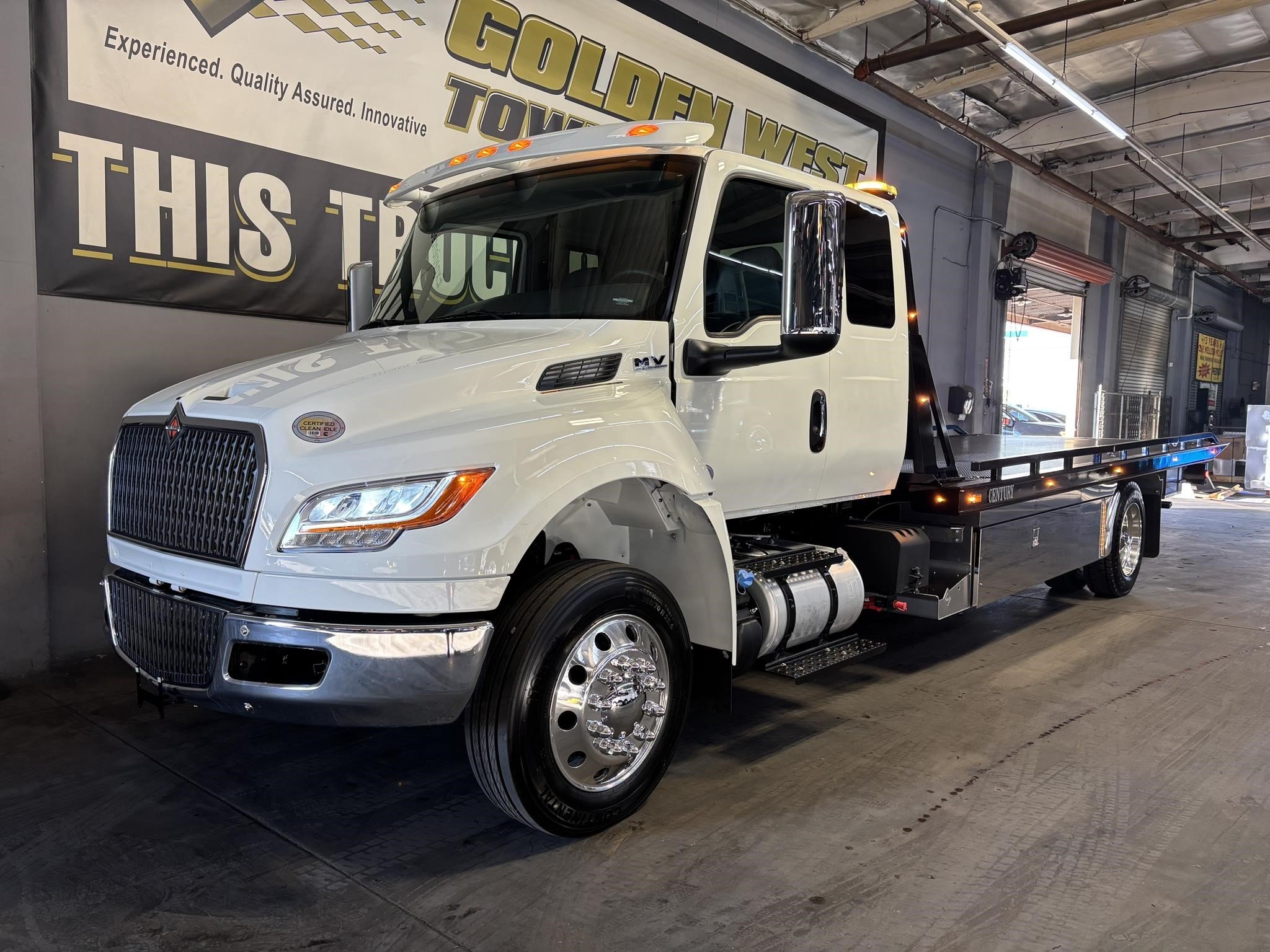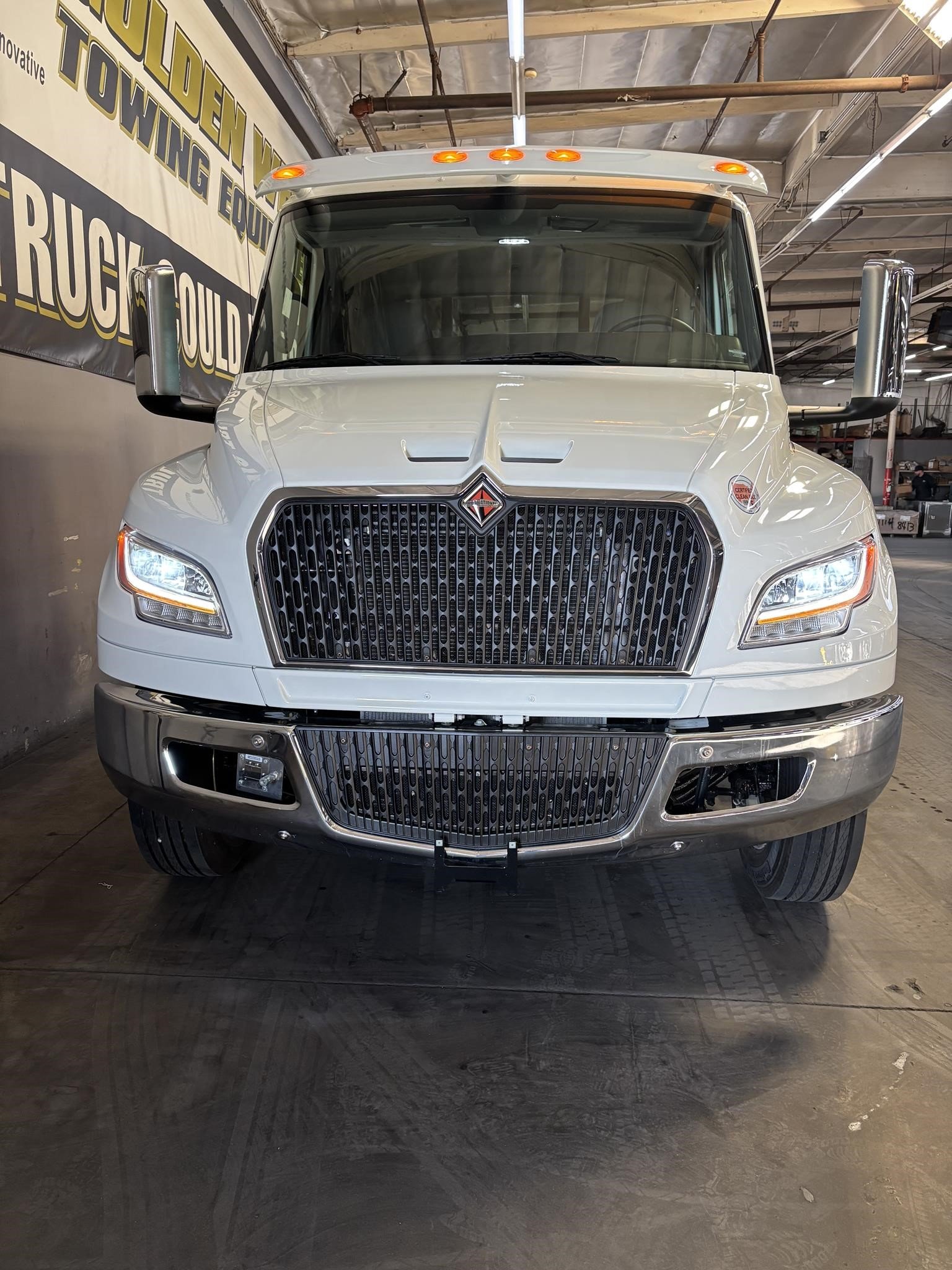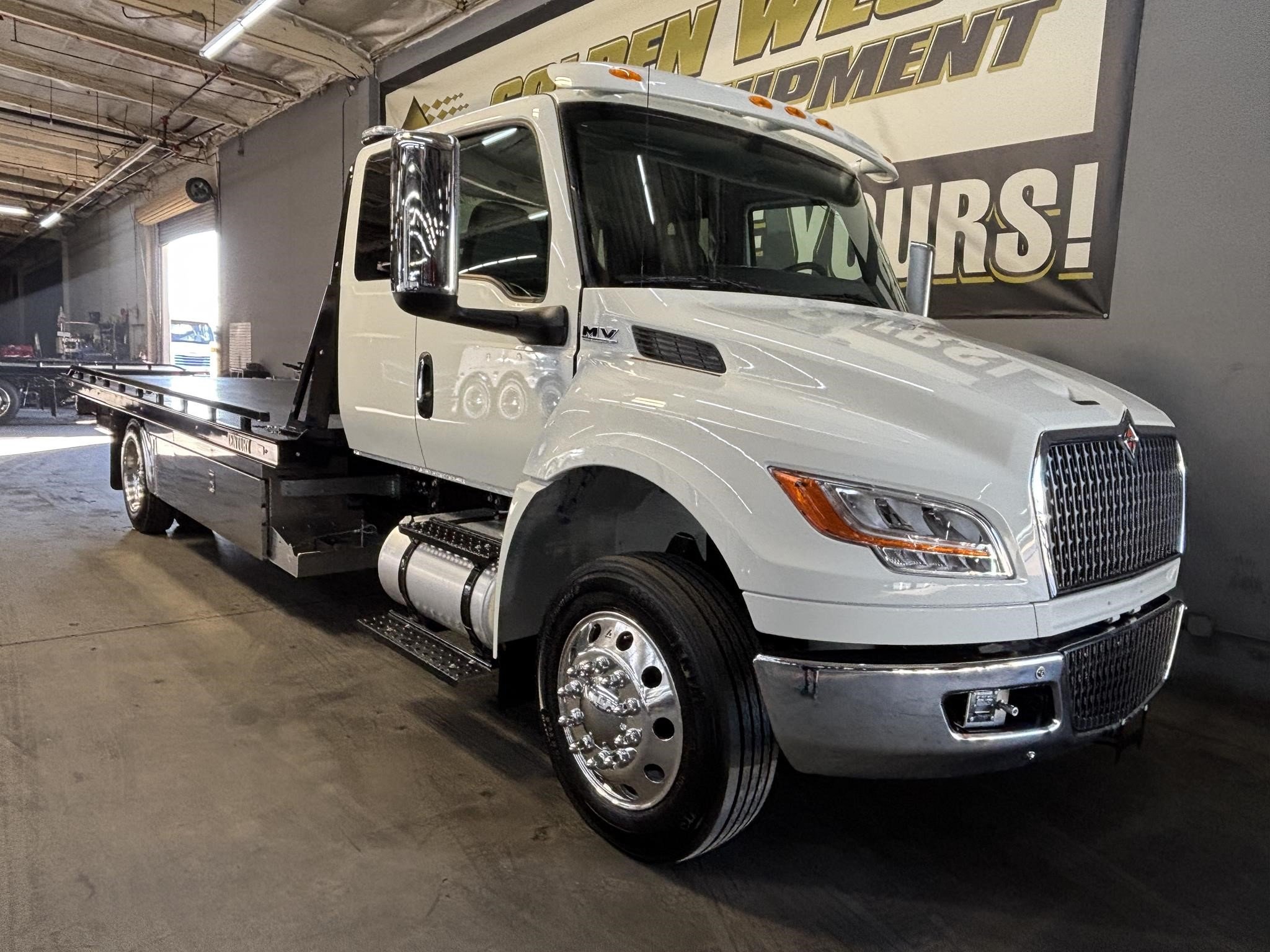 2026 International Model MV Extended cab. Cummins ISB 6.7L, 260HP @ 2,300 rpm, 660 lb-ft @ 1,600 rpm, Allison RDS-2200 6 Speed Auto, Air Brakes, Air Dryer Heater, Exhaust Brake, Front Axle: Dana-Spicer I-Beam 8,000lb w/ Shock Absorbers, Rear Axle: Dana-Spicer 19,000lb rear axle.. , 20,000lb Air Ride Suspension, 4.88 Rear Axle Ratio, Chrome Bumper, black Grille, Air Ride Driver Seat,& Passenger Seat, rear bench seat. Idle Up, Cruise Control, Tilt-Wheel, AM/FM/CD/MP3 w/ Bluetooth, Air Horn, Engine Block Heater, Dual 40-50 Gal Alum Fuel Tanks, 7 Gal DEF Tank, Power Windows, Power Door Locks, Power heated Mirrors. A/C, 255/70R22.5 Tires w/ 22.5 Alum Wheels, Cup holders.Visor 25,500 GVWR,