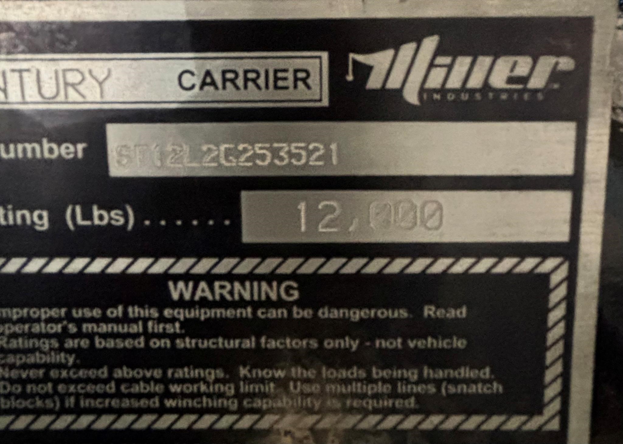 Century Steel LCG (Low Center of Gravity) Carrier w/ Wheel Lift, 3/16 Deck Plate, 3x2 Corten Tube Crossmembers on 8 inch Centers, (4) Rear Chain Locks, (2) Front Chain Locks, (6) Floor Plate Chain Locks (3 per side), 8,000lb Worm Gear Winch, 3/8" x 50' Winch Cable, Illuminated Dual Controls, FMVSS 108 Lamp Group Shock Mounted Lighted, Direct Mount Pump, Cable Roller Guide w/ Tensioner, Winch Free Spool Extension, Back-Up Alarm, (2) Safety Chains, Mechanical Anti-tilt, Black Body Paint, 102" Wide Body, Inboard Tilt Cylinders, Floor Level Roll Formed w/ Punched Stake Pockets, 4,000lb Wheel Lift w/ Releasable L Arms, Fully Hydraulic Wheel Lift, (2) Safety Straps & Ratchets, (2) Rear Safety Chains, Body Lock w/ Nylatron Toller Bearings, & 12,000lb Deck Load Rating. Body SN# ST12L2G253521