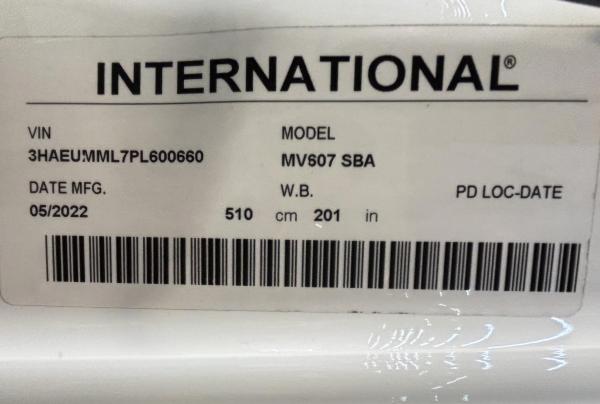 2023 International MV EC 300HP 6.7L Cummins. Allison Automatic. Exhaust Brake. Air Brake Package. Tractor Package. Dual aluminum 50-gallon fuel tanks, Visor, Chrome bumper, Aluminum wheels, Air Ride driver seat, Rear bench seat, Idle up, Cruise control. Tilt wheel, Power windows, Power locks, Power Mirrors, PTO Switch. Aux 5 Switches. Leather wrap Steeering wheel. 8,000lb front axle, 19,000lb Rear axle, 20,000lb rear air-ride suspension with Dump. AM/FM WB, Clock, Bluetooth, USB.Stereo - with 4 speakers-Cab. Block heater. Trailer connector, Air Dryer with Heater, Trailer connectors, Air horn, Electric horn. Air Ride suspension. 108" CAB TO AXLE. 25,500 GVWROriginally purchased with: 5-year 300K PPI Engine and Emissions. 7-year Allison Warranty- Warranty start date 09/30/2026