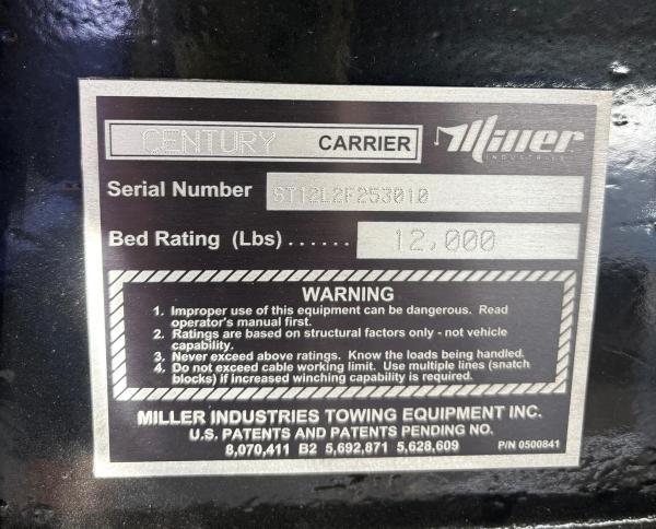 Century LCG 12 21.5' Steel LCG (Low Center of Gravity) Carrier w/ Wheel Lift, 3/16 Deck Plate, 2x2 Corten Tube Crossmembers on 8 inch Centers, (4) Rear Chain Locks, (2) Front Chain Locks, (6) Floor Plate Chain Locks (3 per side), 8K Ramsey winch, 3/8" x 50' Winch Cable, Illuminated Dual Controls, FMVSS 108 Lamp Group Shock Mounted Lighted, Direct Mount Pump, Cable Roller Guide w/ Tensioner, Winch Free Spool Extension, Back-Up Alarm, (2) Safety Chains, Mechanical Anti-tilt, Black Body Paint, 102" Wide Body, Inboard Tilt Cylinders, Floor Level Roll Formed w/ Punched Stake Pockets, 4,000lb Wheel Lift w/ Releasable L Arms, Fully Hydraulic Wheel Lift, (2) Safety Straps & Ratchets, (2) Rear Safety Chains, Body Lock w/ Nylatron roller Bearings, & 12,000lb Deck Load Rating, Body Serial # ST12L2F253010